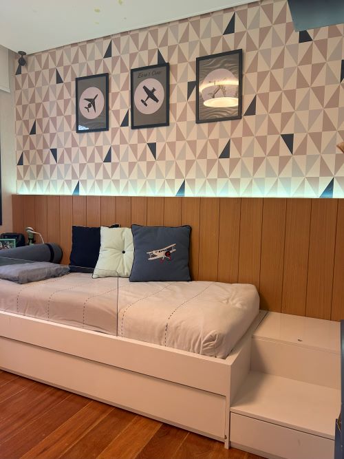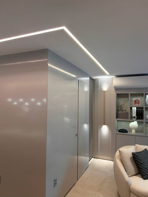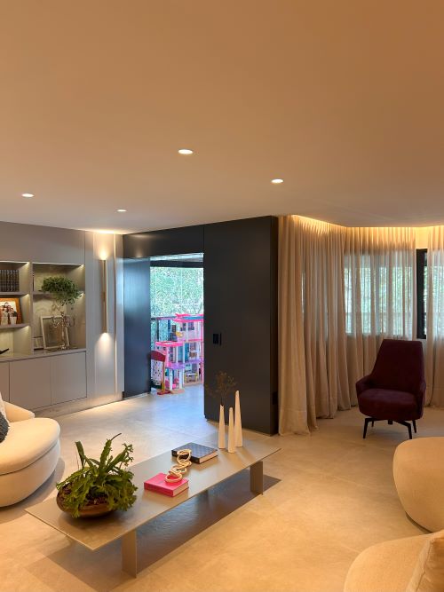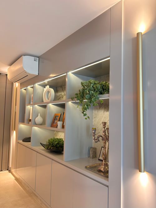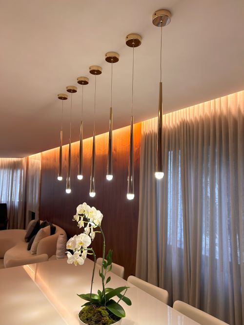 Na reforma deste apartamento foram utilizadas luminárias com design moderno e sofisticado. A iluminação valoriza a arquitetura e marcenaria deixando o ambiente ainda mais bonito e aconchegante.