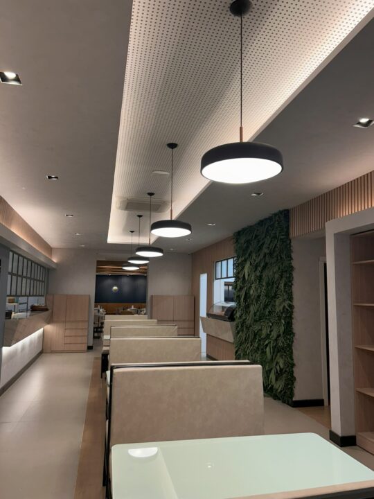 O projeto de um restaurante contemporâneo combina iluminação direta e indireta para garantir sofisticação e conforto. A iluminação direta destaca as mesas, enquanto a indireta cria um ambiente acolhedor. Com materiais modernos e design refinado, o espaço é funcional e visualmente atraente, proporcionando uma experiência gastronômica única.