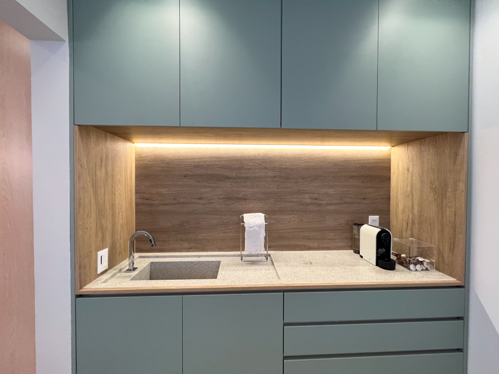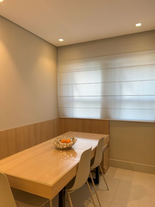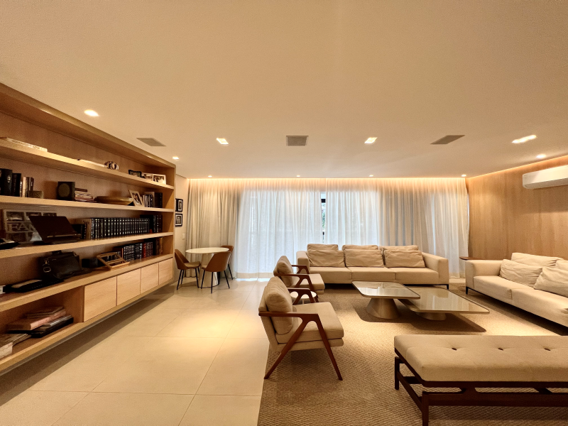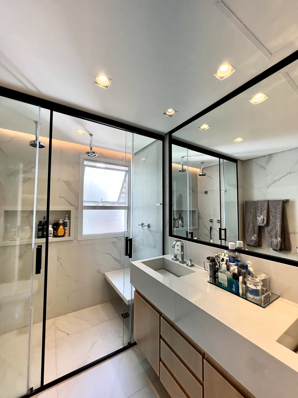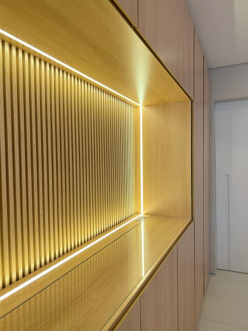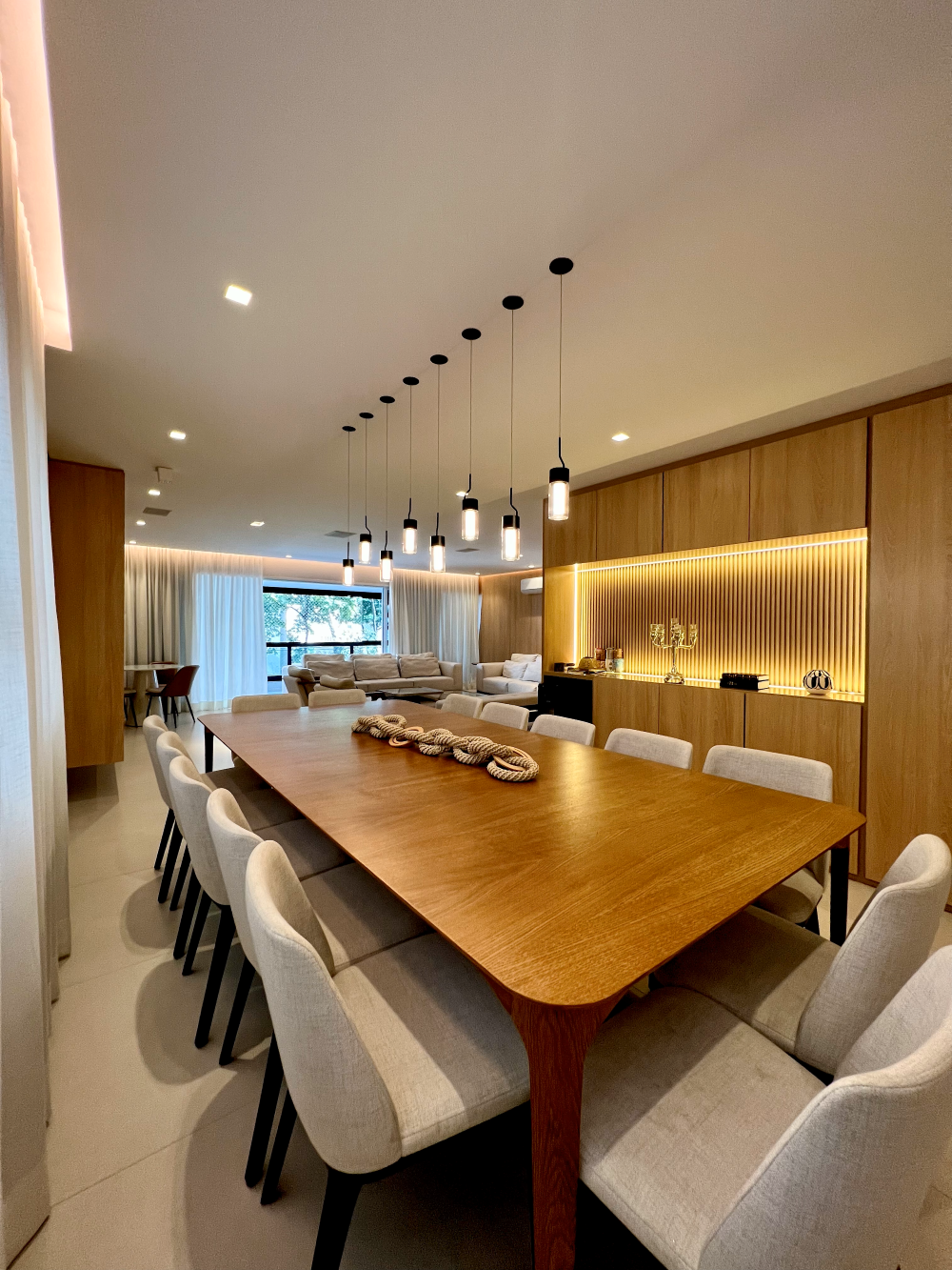 Na reforma deste apartamento, a combinação de iluminação direta e indireta valorizou significativamente cada ambiente, destacando a arquitetura e a marcenaria de maneira notável.